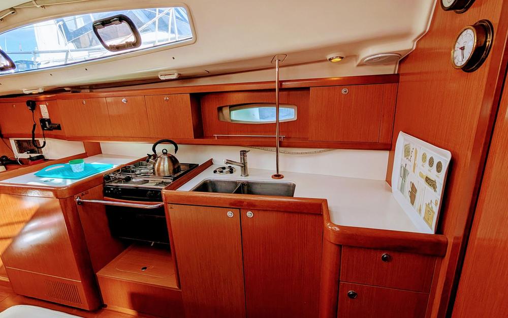 El Oceanis 40 es un velero de 11,82 m ideal para crucero, con un interior luminoso y tres cabinas dobles que ofrecen gran comodidad. Destaca por su mayor con sables forzados y winch eléctrico para su izado, hélice de proa y placas solares, que facilitan la navegación y aportan autonomía.